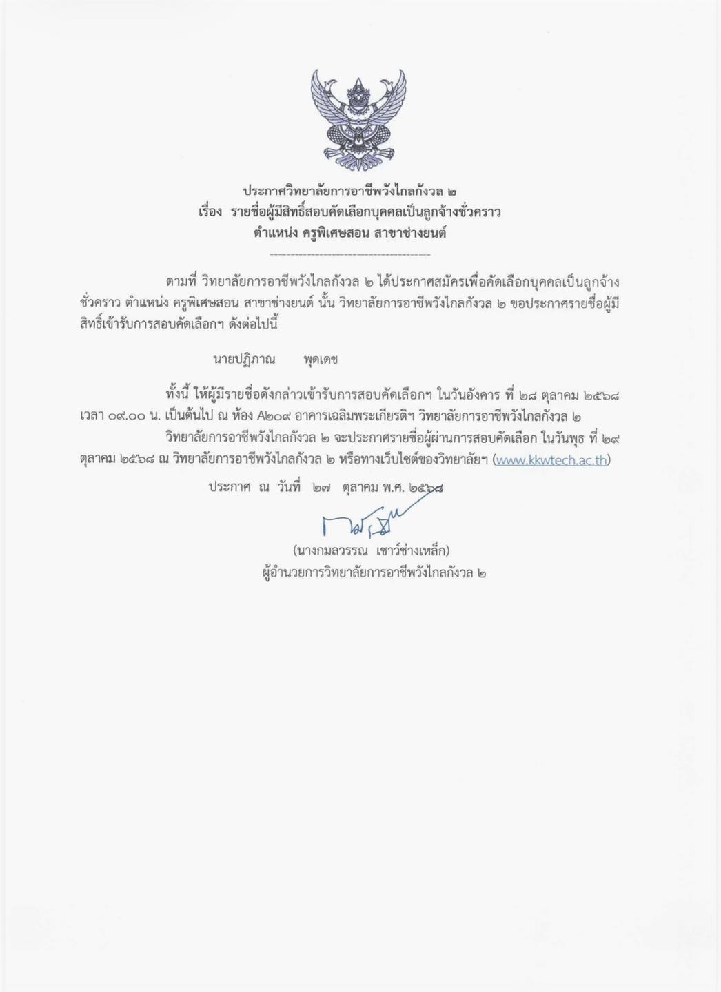 รายซื่อผู้มีสิทธิ์สอบคัดเลือกบุคคลเป็นลูกจ้างชั่วคราว ตำแหน่ง ครูพิเศษสอน สาขาช่างยนต์