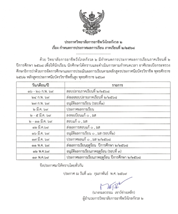 กำหนดการประกาศผลการเรียน ภาคเรียนที่ ๒/๒๕๖๘