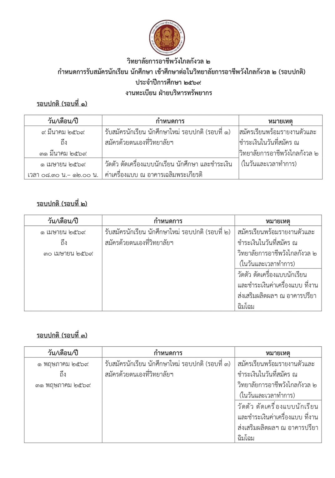 การรับสมัครนักเรียนนักศึกษา ประจำปีการศึกษา 2569 รอบปกติ