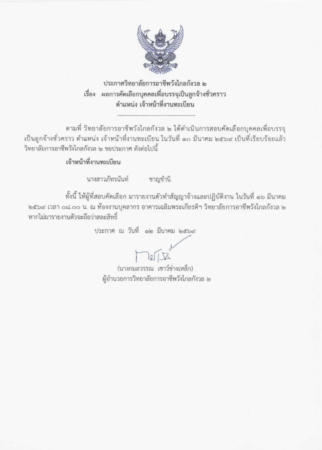 ผลการคัดเลือกบุคคลเพื่อบรรจุเป็นลูกจ้างชั่วคราว ตำแหน่ง เจ้าหน้าที่งานทะเบียน