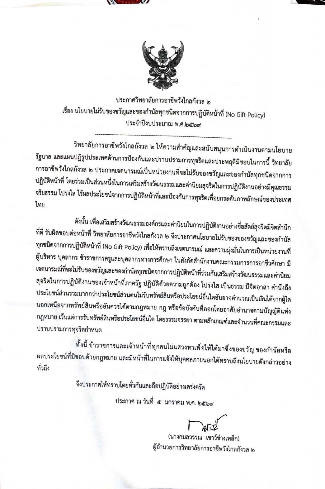 ประกาศเจตนารมณ์นโยบายไม่รับของขวัญ(No GiftPolicy) วิทยาลัยการอาชีพวังไกลกังวล ๒