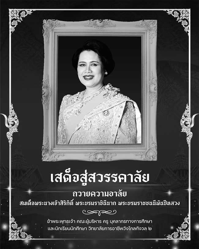 สถิตอยู่ในใจตราบนิรันดร์ น้อมสำนึกในพระมหากรุณาธิคุณเป็นล้นพ้นอันหาที่สุดมิได้ ข้าพระพุทธเจ้า คณะผู้บริหาร ครู บุคลากรทางการศึกษา และนักเรียน นักศึกษา วิทยาลัยการอาชีพวังไกลกังวล ๒
