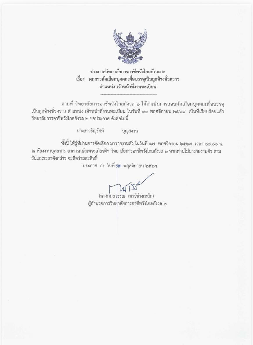 ผลการคัดเลือกบุคคลเพื่อบรรจุเป็นลูกจ้างชั่วคราว ตำแหน่ง เจ้าหน้าที่งานทะเบียน
